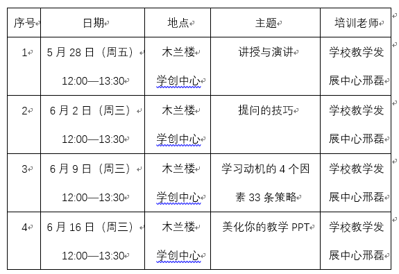 为进一步提升樱花动漫 教师教学能力,学院教学发展分中心根据学院任课教师资格管理细则中《樱花动漫 教师教学能力提升培训计划》,制定了本学期教师教学能力提升培训安排。本学期共安排四次培训,详细安排如下: