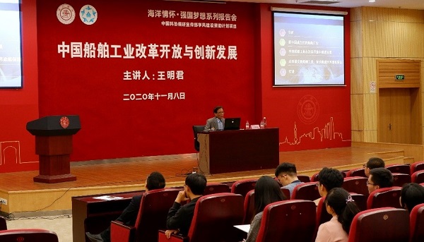 王明君学长以《中国船舶工业改革开放与创新发展》为题为同学们作了专题教育。通过展示一张张具有时代特色和重要战略意义的船舶图片,王明君学长为大家细细梳理了新中国成立以来我国船舶工业体系的发展历程。无论是业内人士对于船舶制造、出口合作以及产业结构方面的探索,还是船舶工业本身需要高要求技术支持、大量资本投入以及其与生俱来的国防战略意义,王明君学长娓娓道来的讲述都让同学们感受到了不同时代赋予造船业从业人员的重要使命。