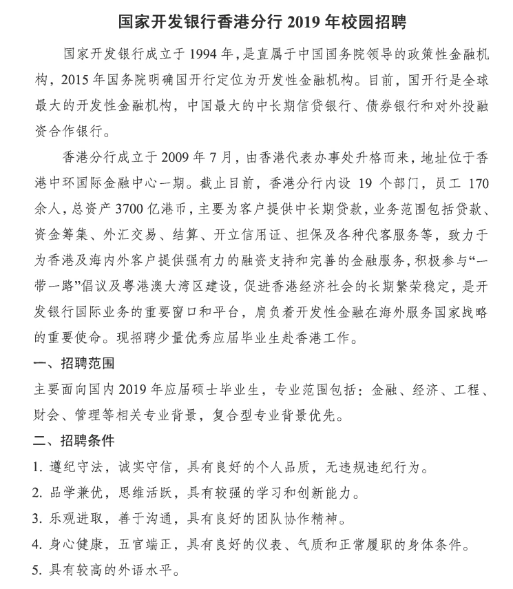 【招聘】国家开发银行香港分行2019年校园招聘