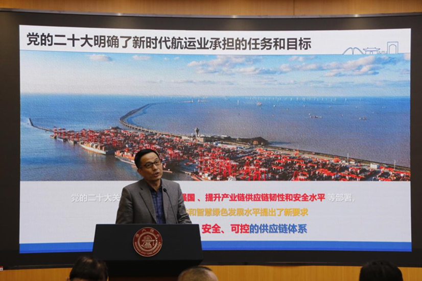 蔡惠星作题为《新时代航运的使命和挑战》,指出党的二十大关于加快建设交通强国、提升产业链供应链韧性和安全水平等部署,对提升航运业韧性和智慧绿色发展水平提出了新要求;同时分析了新时代航运面临的主要挑战并提出了对策与建议,呼吁学校进行多学科融合创新和人才协同交叉培养。
