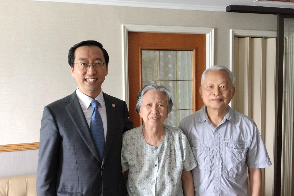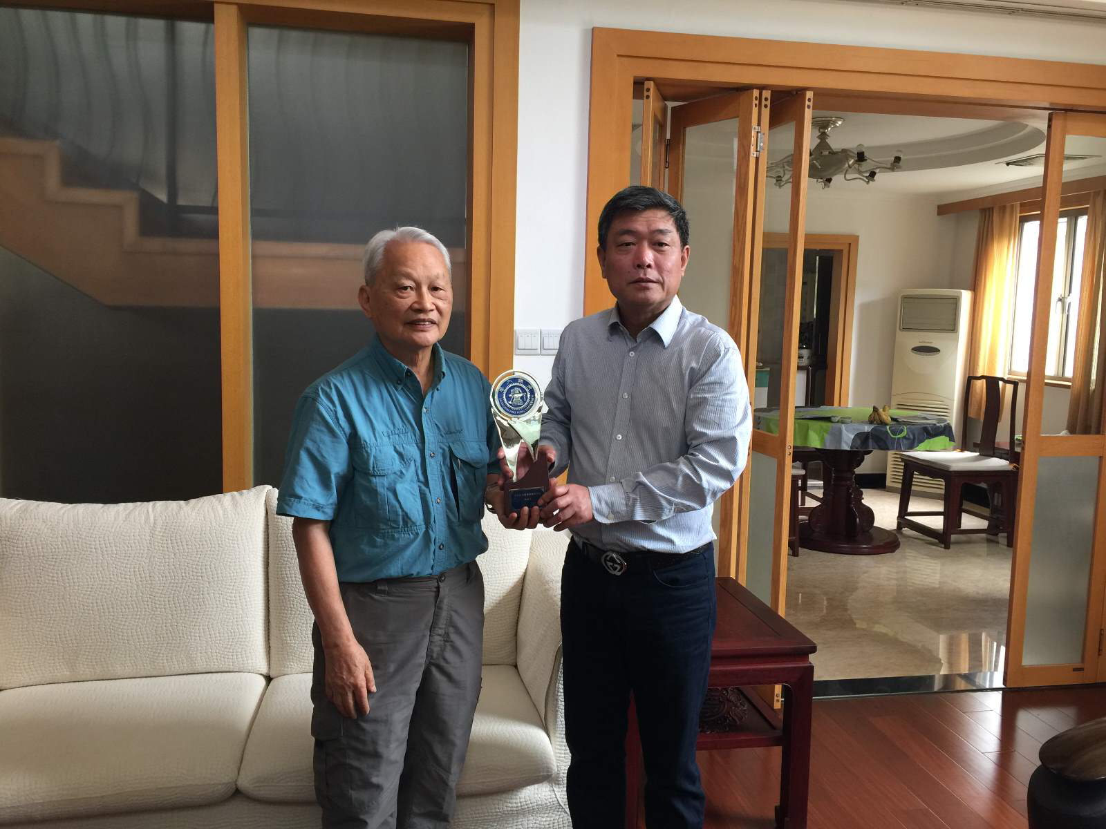 2016年5月23日,张安胜副校长赴周学长上海家中探望并致送杰出校友奖奖杯。