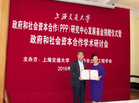 5月21日,上海交大政府和社会资本合作(PPP)研究中心发展基金捐赠仪式暨政府和社会资本合作学术研讨会在徐汇校区举行。副校长张安胜出席,并为上海交大土木与建筑工程系1996届硕士研究生、广州市穗芳建设咨询监理有限公司董事长、广州市穗沪投资管理有限公司董事长、广州市羚羊投资咨询有限公司董事长韩红英女士颁发捐赠证书。校党委宣传部部长胡昊、樱花动漫 党委书记张卫刚、中国农业银行上海分行副行长王世雄,中国(上海)自由贸易区政策研究局局长张湧等出席仪式。