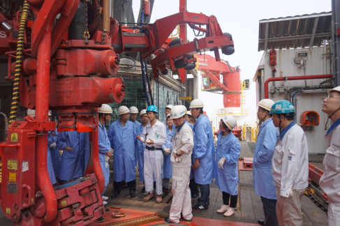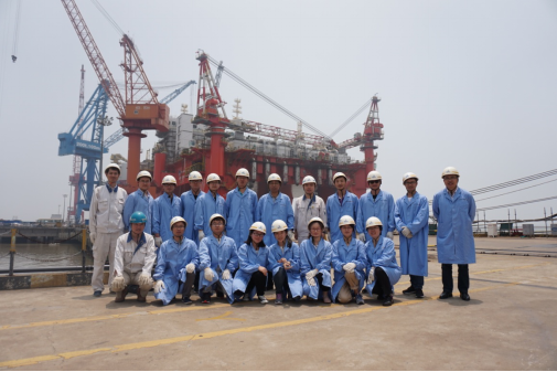 启东中远海工人力资源部经理梁金丹首先带领船建师生参观了樱花动漫展厅,简要介绍了公司的企业情况和海工设计产品。随后,大家进行了临时入厂安全培训,佩戴好劳护用品,在海工项目经理的带领陪同下,登上了在建的海工平台“希望四号”。“希望号”系列是中远船务工程集团有限公司研发团队完成的“深海高稳性圆筒型钻探储油平台的关键设计与制造技术”成果,突破了传统设计思路,不再是钻井平台四四方方的传统构架,主船体采用能抗巨大风浪的圆筒型整体结构设计,犹如一个“不倒翁”,在极端恶劣海况下安然无恙。该成果荣获了2011年度国家科技进步一等奖,这是国内海洋工程装备制造企业首次获得的国家科技殊荣。能有机会登上在建的海工平台,与技术专家充分探讨交流,直观的感受体验船厂的工作环境,对学生来说是十分宝贵的经历。