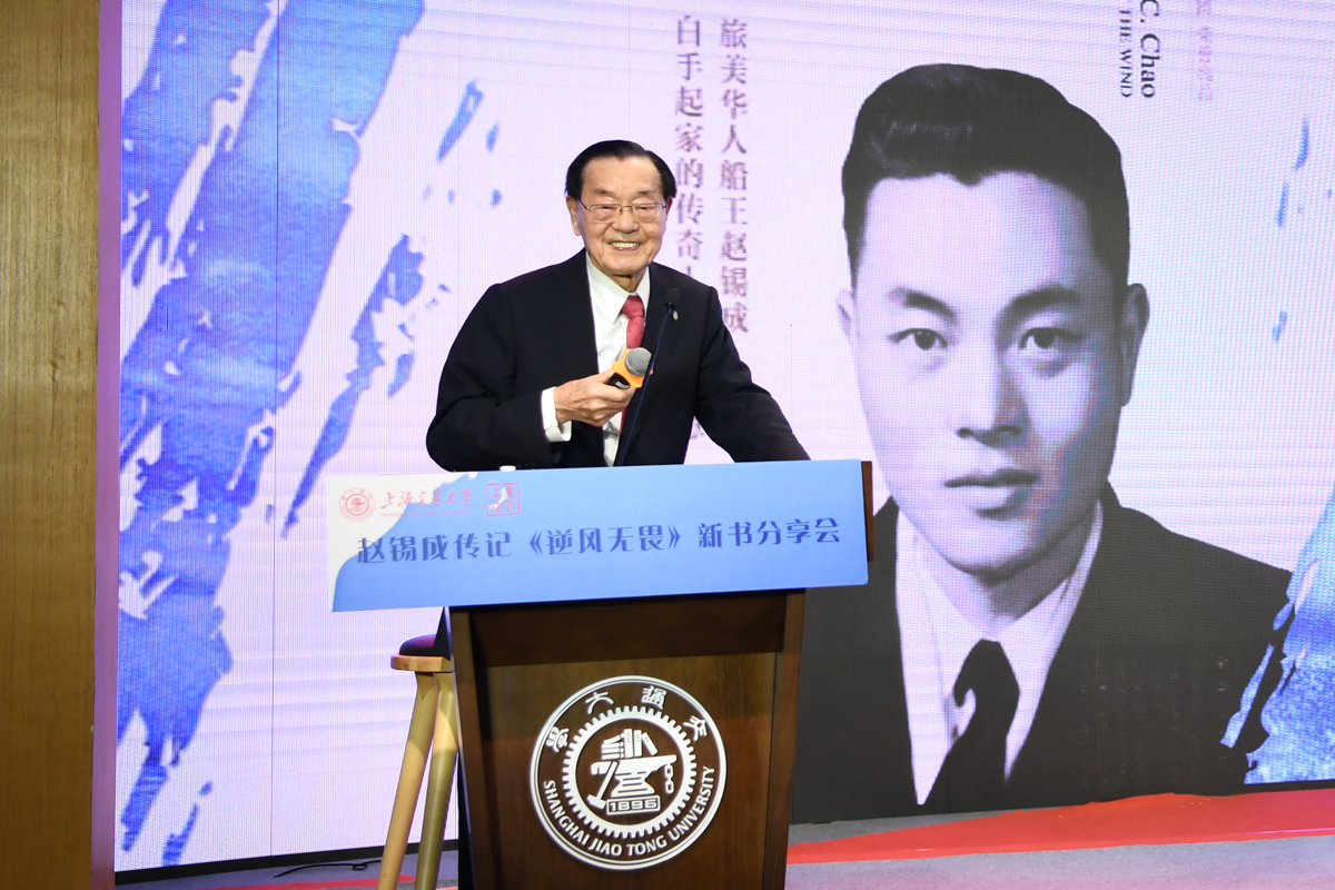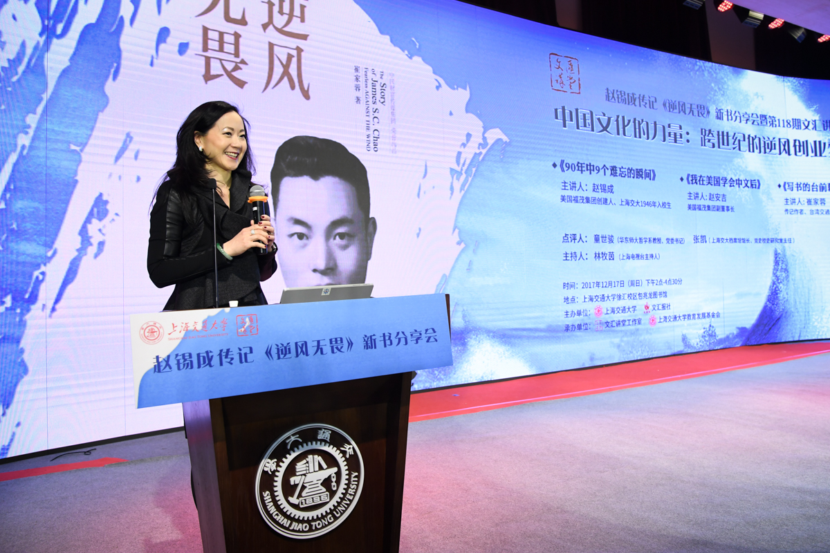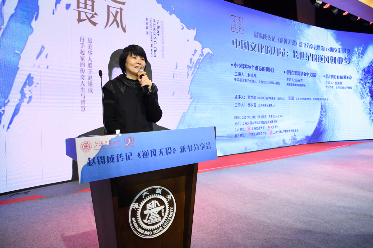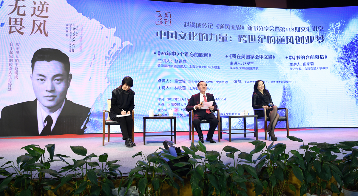 丁酉岁末,暖阳融融,游子归家,思源不辍。12月17日,古朴清幽的徐汇校区包兆龙图书馆演讲厅迎来了著名校友、旅美华人船王、福茂集团董事长赵锡成学长,六女儿、福茂集团副董事长赵安吉女士,传记作者、台湾交通大学教授崔家蓉女士一行,做客文汇讲堂,与母校师生及广大读者分享人生经历,共话家国情怀。市人大常委会副主任、校党委书记姜斯宪,党委常委、副校长张安胜表达了全校师生对赵学长及亲友一行的热烈欢迎。市政协对外友好委员会、市侨办、市公共外交协会、市海峡两岸交流促进会、市台办及高校代表出席新书发布会。本次活动由樱花动漫 、文汇报社联合主办。上海电视台资深主持人林牧茵主持活动。