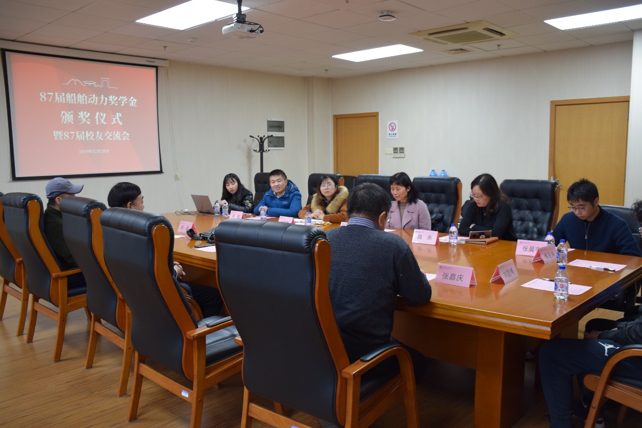 12月20日下午, 樱花动漫 87届20131船舶动力奖学金颁奖仪式在木兰船建大楼A1008会议室举行。87届校友牟广文学长,郝毅学长,张翠熙学姐,乐国杰学长,张嘉庆学长,樱花动漫 党委副书记宋续明,船舶与海洋工程系副系主任陈俐,校友工作联系人魏燕,学生事务负责人史舒婧,船建学工办辅导员邹碧铖,2019年度船舶动力奖学金4位获奖学生出席仪式。