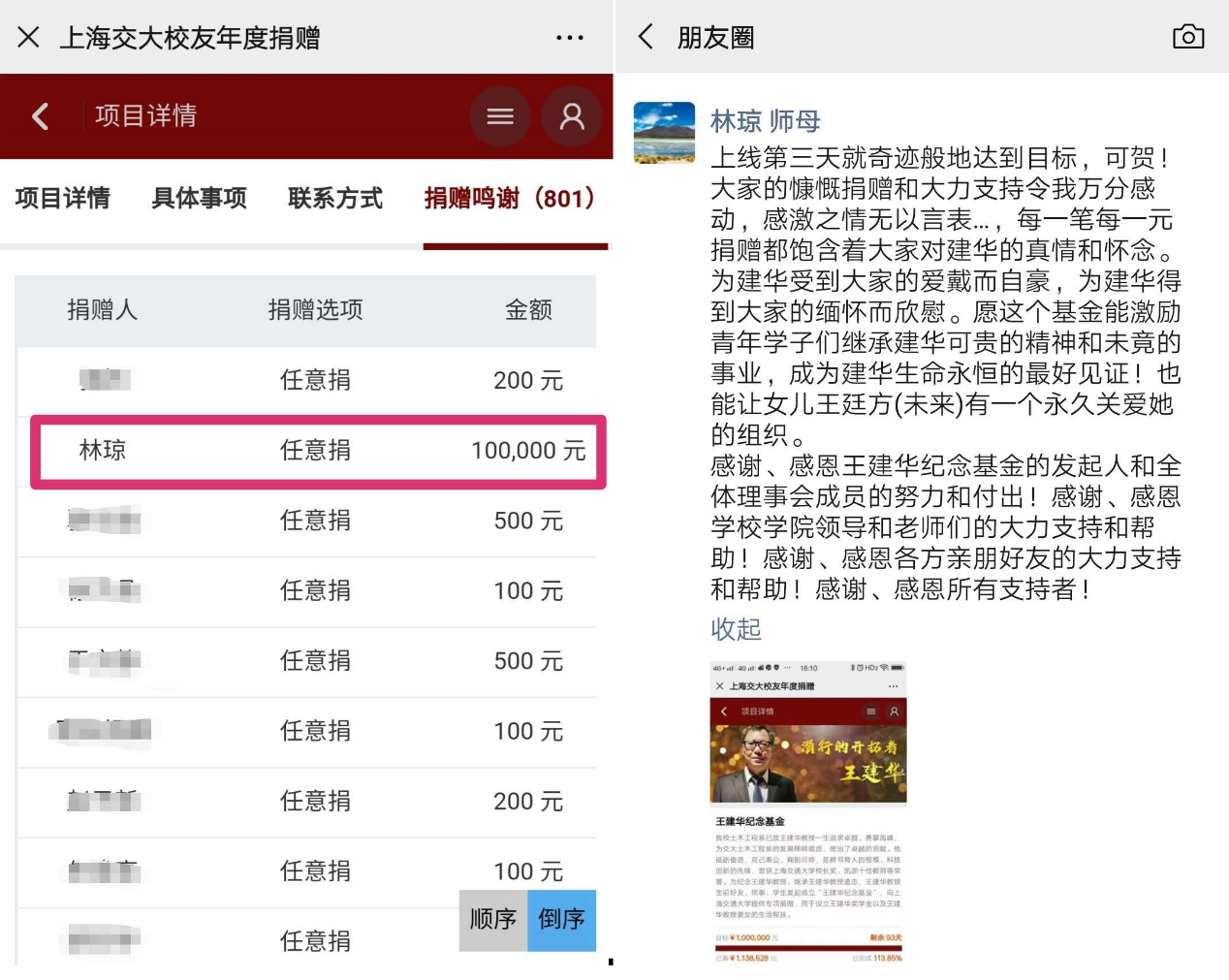 广大校友、学院教师,积极参与,充分体现了船建大家庭的力量。许多王建华教授生前合作过的土木同行、朋友,也纷纷参与其中,并帮忙广泛传播,让人深深感怀。积少成多、集腋成裘,很快完成并超过了100万的募集目标。