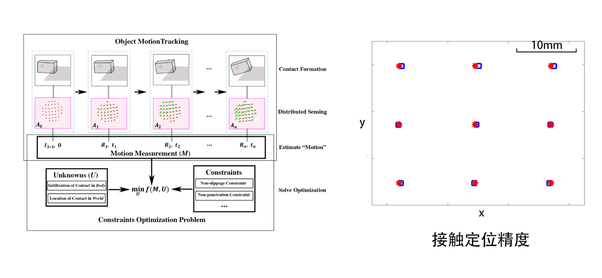 基于运动跟踪的能力,进一步提出了”外部接触感知“理论框架,实现了依靠触觉定位机器人执行自动化装配等富含接触操作任务中物体与外部环境的接触位置,如图2。 上述能力为实现触觉伺服控制提供了关键的状态估计信息,为智能机器人进一步精确控制接触行为铺平道路。同时,传统触觉传感器的开发只专注于接触力的测量,而本研究在崭新的测量维度(运动跟踪)上展示了触觉感知对智能机器人的价值,因此可以指引触觉传感器功能开发及优化的新方向。未来,我们将继续专注于以接触感知与控制为核心的机器人操作研究。”