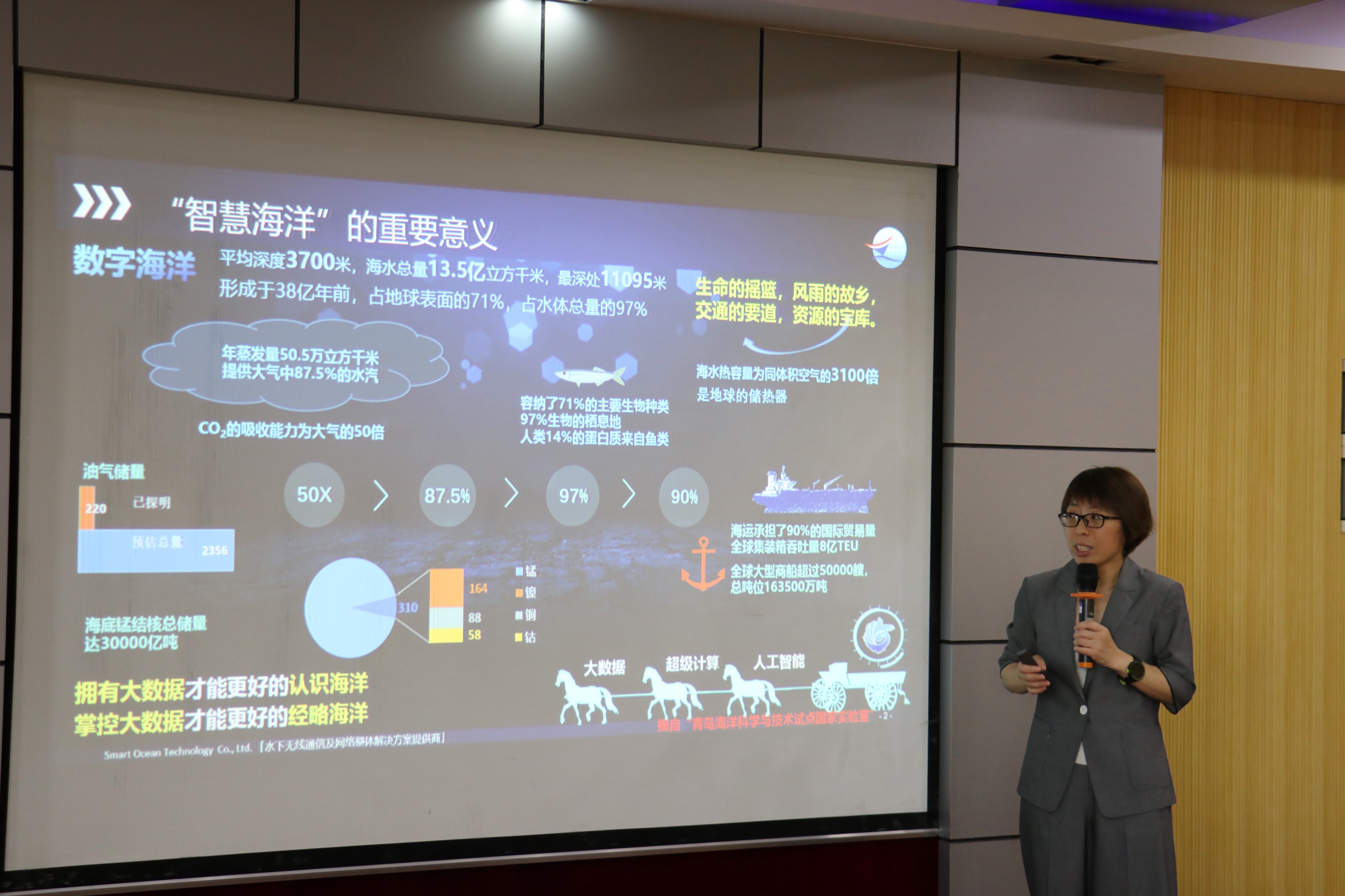聘任仪式后,崔军红教授做客樱花动漫 “旭华讲坛”。她以 “智慧海洋技术发展与展望”为主题为在座的师生做了一场精彩的报告。报告中,崔军红教授从智慧海洋的重要意义出发,详细分析了产业需求,回顾了海洋技术的发展历程。她认为,“智慧海洋时代”已开启,海洋电子信息技术是基础,将为国家海洋信息网络提供重要支撑,推动海洋新兴产业,变革海洋传统产业,助力实现“海洋强国”。报告内容丰富精彩,呈现了未来智慧海洋时代的发展重点和趋势,全院师生受益匪浅。会后各位与会教授表示将和崔军红教授做深入的技术交流,开展实质性合作,推动学校的“大海洋”行动计划。