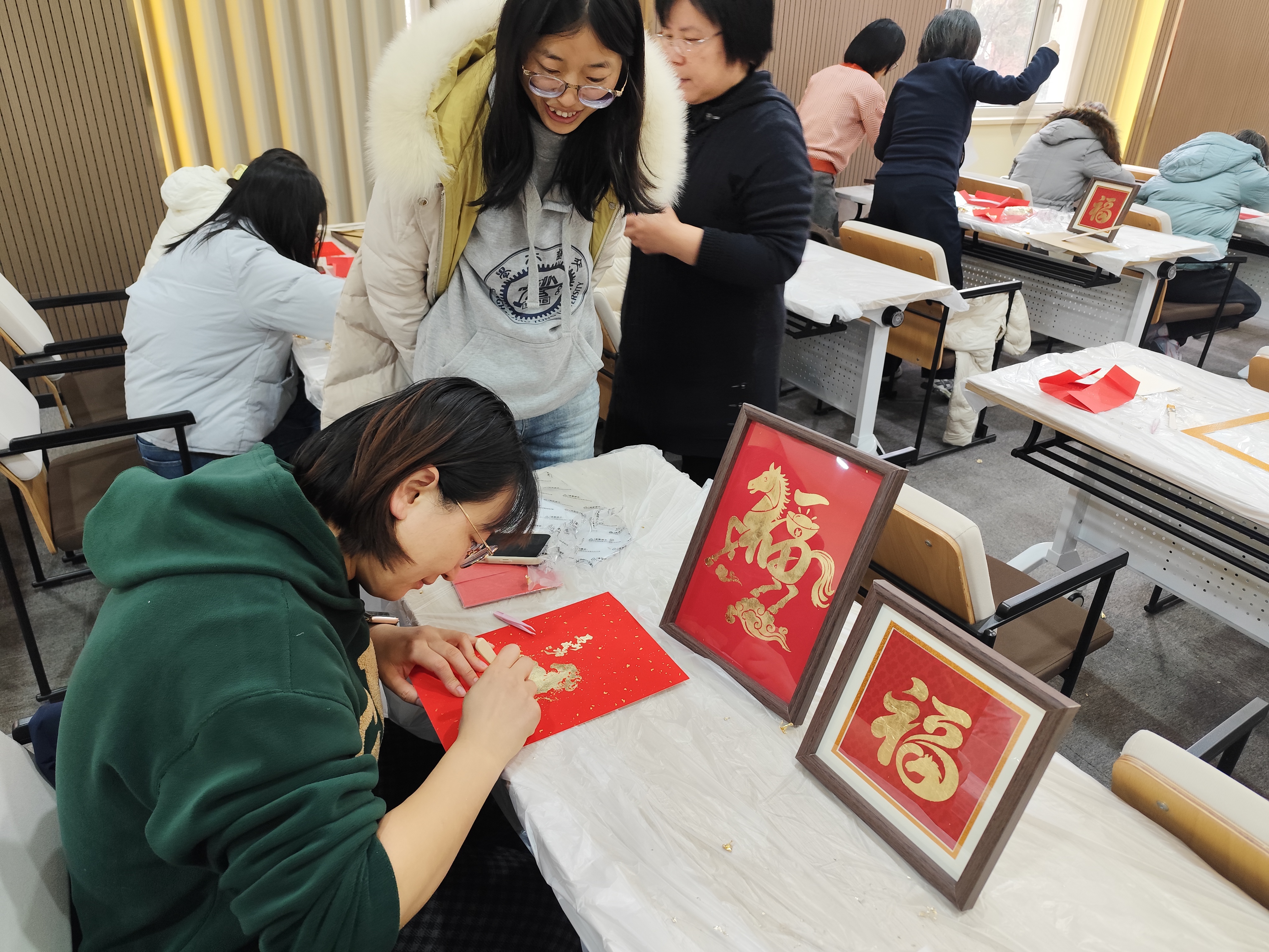 作品摆满长桌,瞬间升级为最火打卡点。大家举起手机,“咔嚓”声此起彼伏,马年祝福与巾帼心愿并肩。镜头里,金箔闪耀,巾帼笑颜比金更亮。