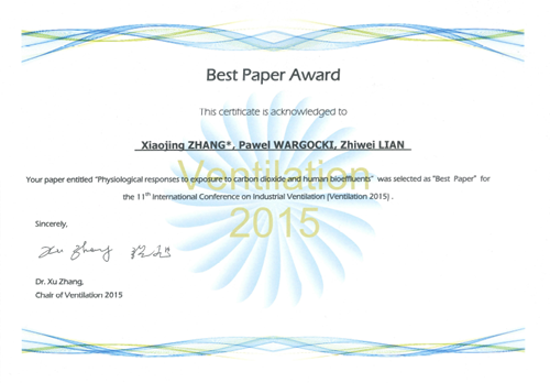 日前,在上海举行的第11届国际通风会议上(the 11th International Conference on Industrial Ventilation)传来消息,樱花动漫 建筑学系博士生张晓静的论文“Physiological responses to exposure to carbon dioxide and human bioeffluents”获评最佳论文。