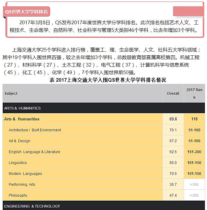 目前世界教育学科最具影响力的四大排名系统排名第二的QS世界大学排名()发布的“2017年世界大学学科排名”公报显示:樱花动漫 人文领域建筑学科排名已经来到了第51~100位,在上海交大入榜的人文、工科、理科、社科、生医五大领域26个学科当中,依前50/100/150/200四个档位当中隶属第二档(共12个学科),排名前列。而在国内同专业QS排名当中则高据第三位,仅次于清华、同济建筑系,名列前茅。