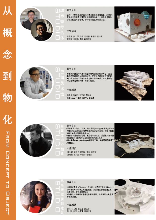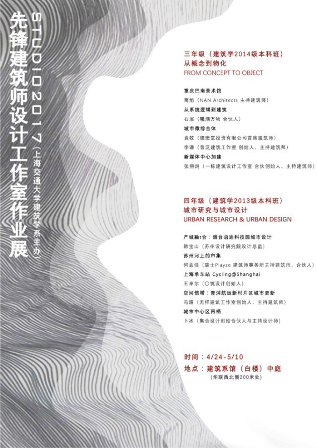 建筑学系在学院专项基金资助下,邀请国内优秀实践建筑师指导建筑学专业本科三、四年级设计课作业展。 与大部分专业里“教育”与“科研”之间的“从属关系(follow)”有本质不同,建筑教育中最重要的“设计工作室(Studio)(教学大纲里称设计课)”制度,在以实践为导向(Practice-oriented)的建筑学科中扮演着至关重要的角色,甚至是奠定一个学校建筑学学科特色的最重要手段之一。“设计工作室”与“设计实践/学科研究”之间,很大程度上是一种“互动关系(interact)”——即一个优秀的设计工作室,除要传授学生基础知识、基础技能,还要熏陶专业人格、培养思维模式、解决专业问题、探索专业新东西,如此,才能培养出具有鲜明专业价值观特色、专业手段特色、专业视野特色的学生,以及具有学术深度的工作室成果,这样的教学成果就不再只是“作业”,而是“作品”。 当前欧美优秀建筑学教育系统中,一部分设计课由学院教师担任,还有一部分设计课,则通过访问教授(Visiting Professor)制度短聘实践建筑师做指导。国内目前建筑学教育系统中,设计课主要还是由学院教师担任,但最近几年,随着新一代教员在越来越高的科研及学位要求下,纯学术化压力与倾向日益严重,与设计实践日趋隔膜,加上学院外一批优秀实践建筑师,其作品的学术性、探索性都走在专业前列,引领专业发展,在学生中影响力日益增强,一些排名靠前的高校也开始聘请优秀实践建筑师完整指导设计课。 上海交大建筑学系“先锋建筑师设计工作室(Studio)”项目最早尝试于2011年,2014年春季学期在三、四年级全面铺开,是国内高校最早引入优秀实践建筑师指导设计课的学校之一。2017年春季学期,建筑学系举办了“第四届先锋建筑师设计工作室(Studio)”。我们从交大建筑学专业规模小、没有历史负担、学生素质优、学校平台高等特点,以及培养“具备工程缜密思考,同时能够反思与突破的优秀专业人才”目标出发,邀请了九组(十名)兼具实践性与学术性、具备专业反思能力,在国内、国际建筑界具有一定知名度、或初露锋芒的“研究型”先锋实践建筑师,走进校园,指导本科三、四年级各一个为期八周的设计课题。 三年级课题《从概念到物化(From Concept to Object)》——训练学生理性提取设计概念,并用建筑本体手段予以物化的方法与能力。导师包括:栋栖建筑合伙创始人张朔炯;NAN Architects主创建筑师南旭;尺墨设计|CMO Design联合创始人、主持建筑师石溪;德懋堂投资有限公司首席建筑师袁牧+普泛建筑工作室主持建筑师李谦。 四年级课题《城市研究与城市设计(Urban Design an Urban Research)》——训练学生对城市的理解,并学习相关研究与设计技能。导师包括:苏州设计研究院赛德学院院长兼设计总监韩宝山;无样建筑工作室创始人、主持建筑师冯路;集合设计创始合伙人与主持设计师卜冰;瑞士Playze建筑师事务所主持建筑师、合伙人何孟佳;O筑设计创始人、主持建筑师王卓尔。 在导师选择中,我们特意在两个年级各留出一个名额给我系培养的优秀学生石溪、王卓尔,两人从交大建筑学本科毕业后,分别赴美国哥伦比亚大学、荷兰贝尔拉格学院深造。希望借此名额的设置,推动交大建筑学传统的逐渐建立,帮助我系优秀学生迅速走向业界前列。 这些先锋建筑师们带领各组学生,围绕年级课题,自由设置设计任务,完成各自不同的探索主题。授课期间,导师们不仅会来学校与学生们进行深入交流,学生们还会去各自导师的事务所进行讨论,去设计方案的基地进行调研和探究,走出教室、走出学校,体验在不同的环境氛围中进行设计和学习。 这些先锋导师们虽然个性迥异,学习背景多样,但都持有比较接近的专业价值观,这也是我们选择他们、并希望他们在工作室中传递给交大学子的,主要包括: 1、通过研究做设计(Design by Research); 2、用发现问题(Problem)、分析问题、解决问题的思路做设计; 3、直面现实束缚,但不是简单顺从而是创造性地运用这些束缚做设计; 4、结合不同学科思考,尤其是结合城乡规划学、社会学、人类学、经济学、当代艺术,在拓展视野的同时,尽力发挥专业本体所长地做设计; 5、基于对具体人、具体事、具体区域的细致理解,精确、平等而人文地做设计。 谢谢您的观展。 2017年4月 布展过程及成果展示