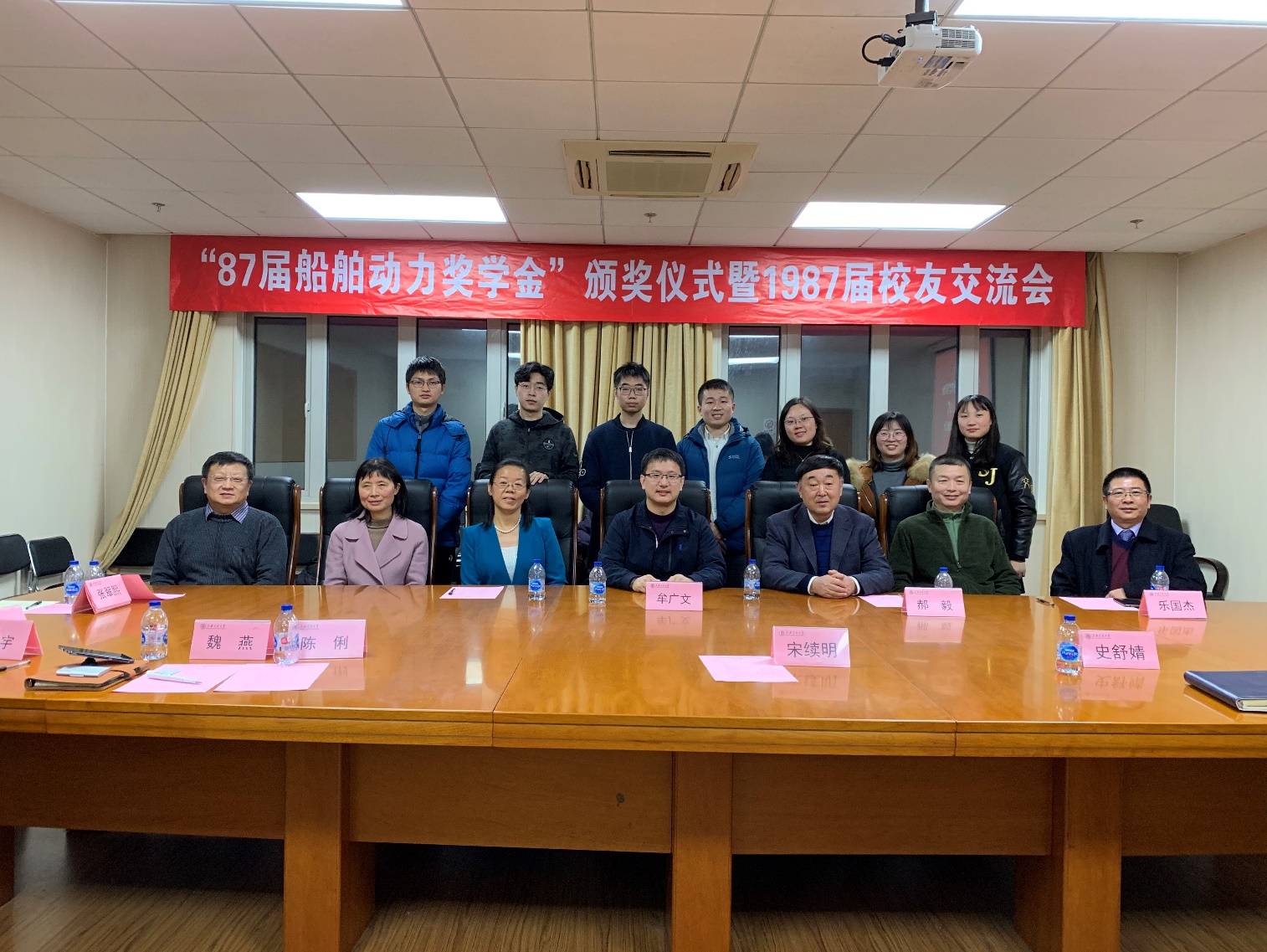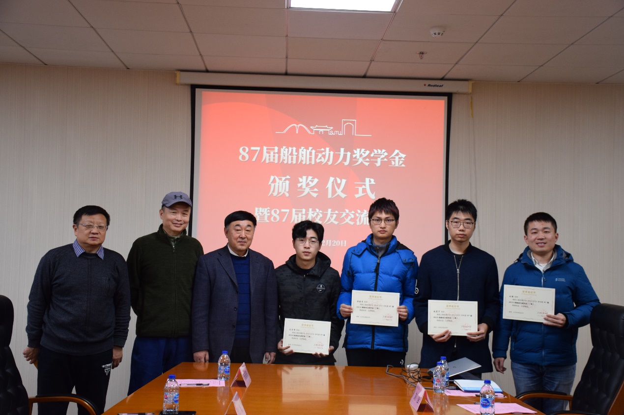 12月20日下午, 樱花动漫 87届20131船舶动力奖学金颁奖仪式在木兰船建大楼A1008会议室举行。87届校友牟广文学长,郝毅学长,张翠熙学姐,乐国杰学长,张嘉庆学长,樱花动漫 党委副书记宋续明,船舶与海洋工程系副系主任陈俐,校友工作联系人魏燕,学生事务负责人史舒婧,船建学工办辅导员邹碧铖,2019年度船舶动力奖学金4位获奖学生出席仪式。