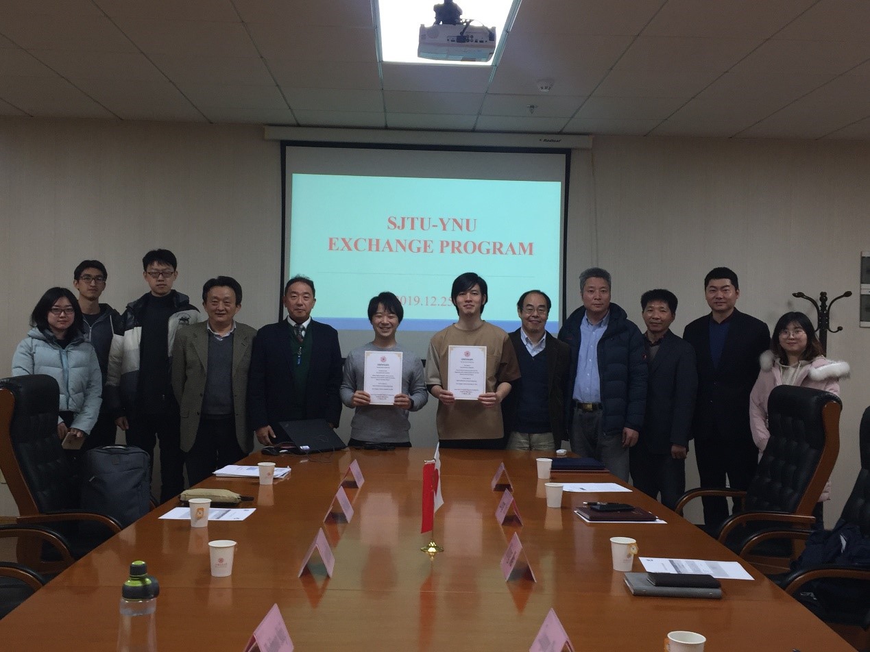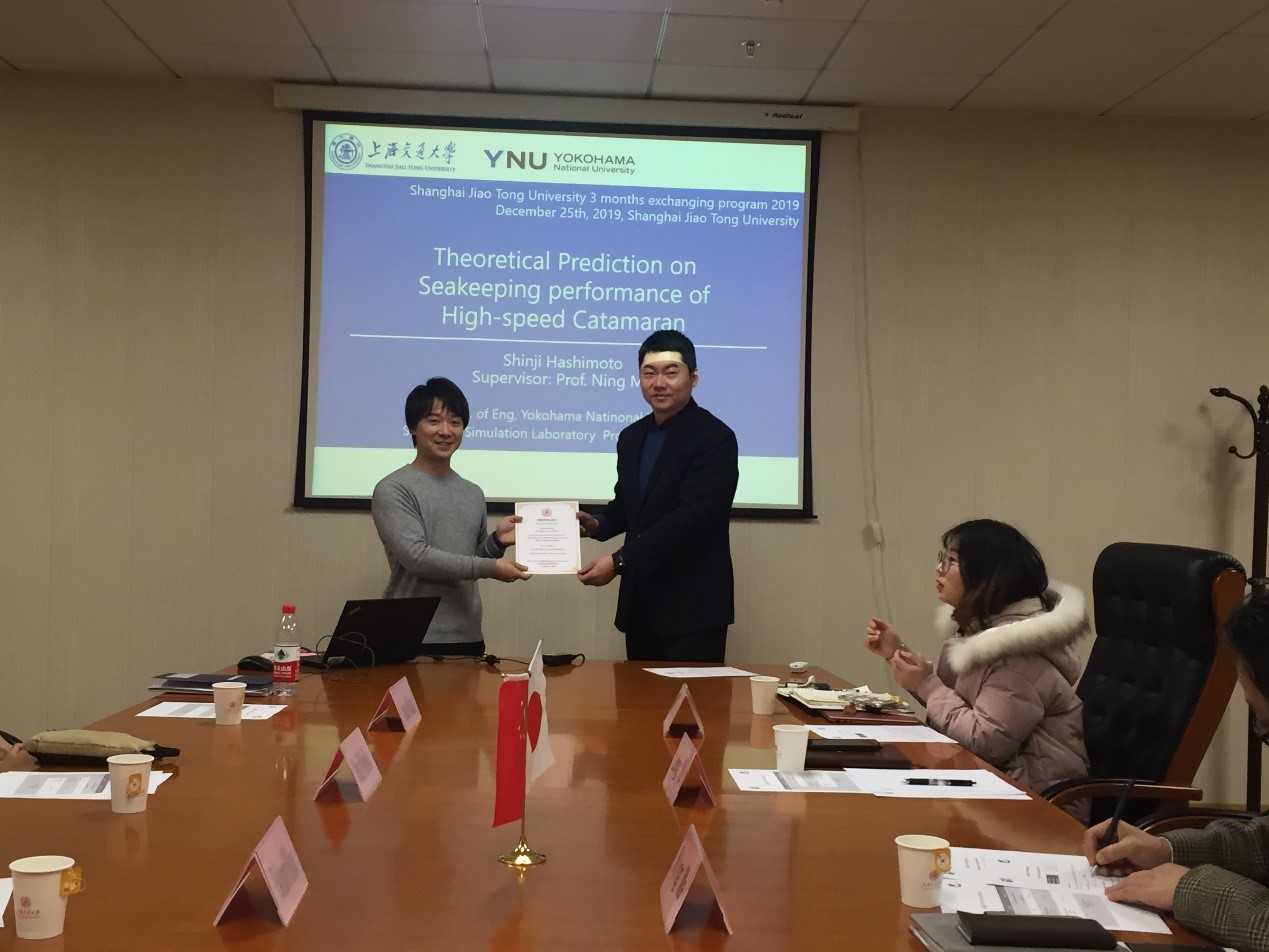 12月26日2019年度SJTU-YNU Joint Workshop暨日本横滨国立大学短期(三个月)交流交换生结业典礼在木兰船建大楼A1008会议室举行,樱花动漫 导师代表马宁老师、陈作钢老师、余龙老师、顾解忡老师和学工办史舒婧老师,学院船海系、土木系部分学生代表出席结业典礼,横滨国立大学(YNU)的Takanori Hino和Motohiko Murai两位教授专程前来参加结业典礼和学生答辩。