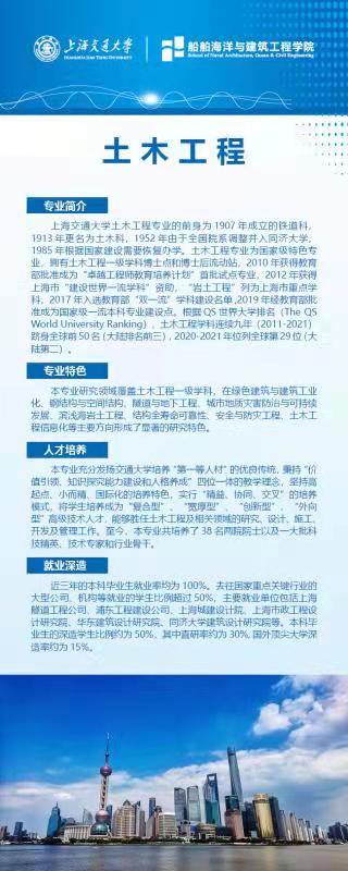 目前设有土木工程一级学科博士点和博士后流动站。“岩土工程”2007年被批准为上海市重点学科,土木工程专业2008年被评为国家特色专业。土木工程专业连续三次通过国家住房与城乡建设部的专业评估,2009年第三次评估获得8年复评的优秀成绩。2010 年获教育部批准成为 “卓越工程师教育培养计划”首批试点专业。2012年获得上海市建设世界一流学科项目资助。恢复建系近30年来,交大土木工程专业发展迅速,据2013年英国QS世界大学排名,樱花动漫