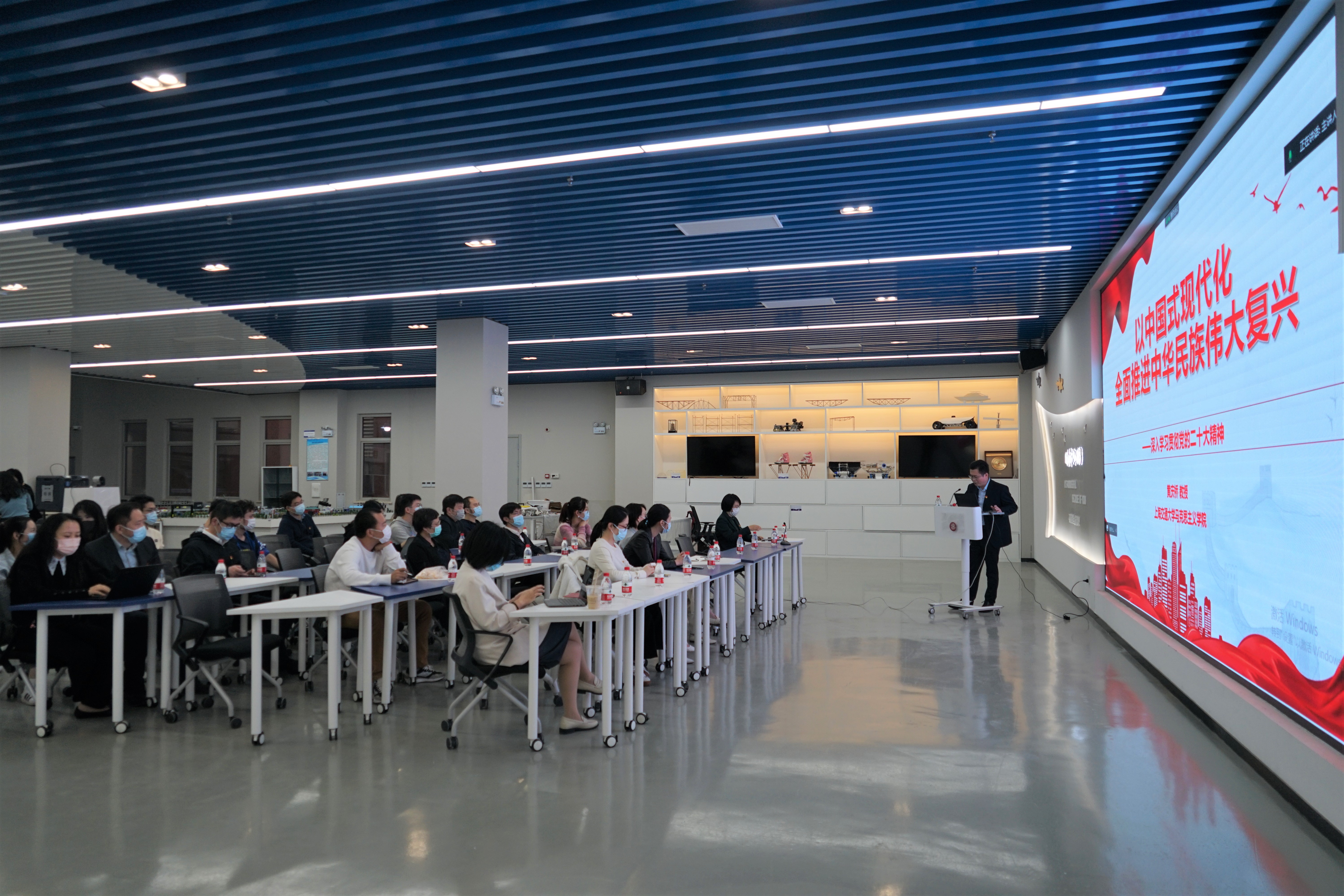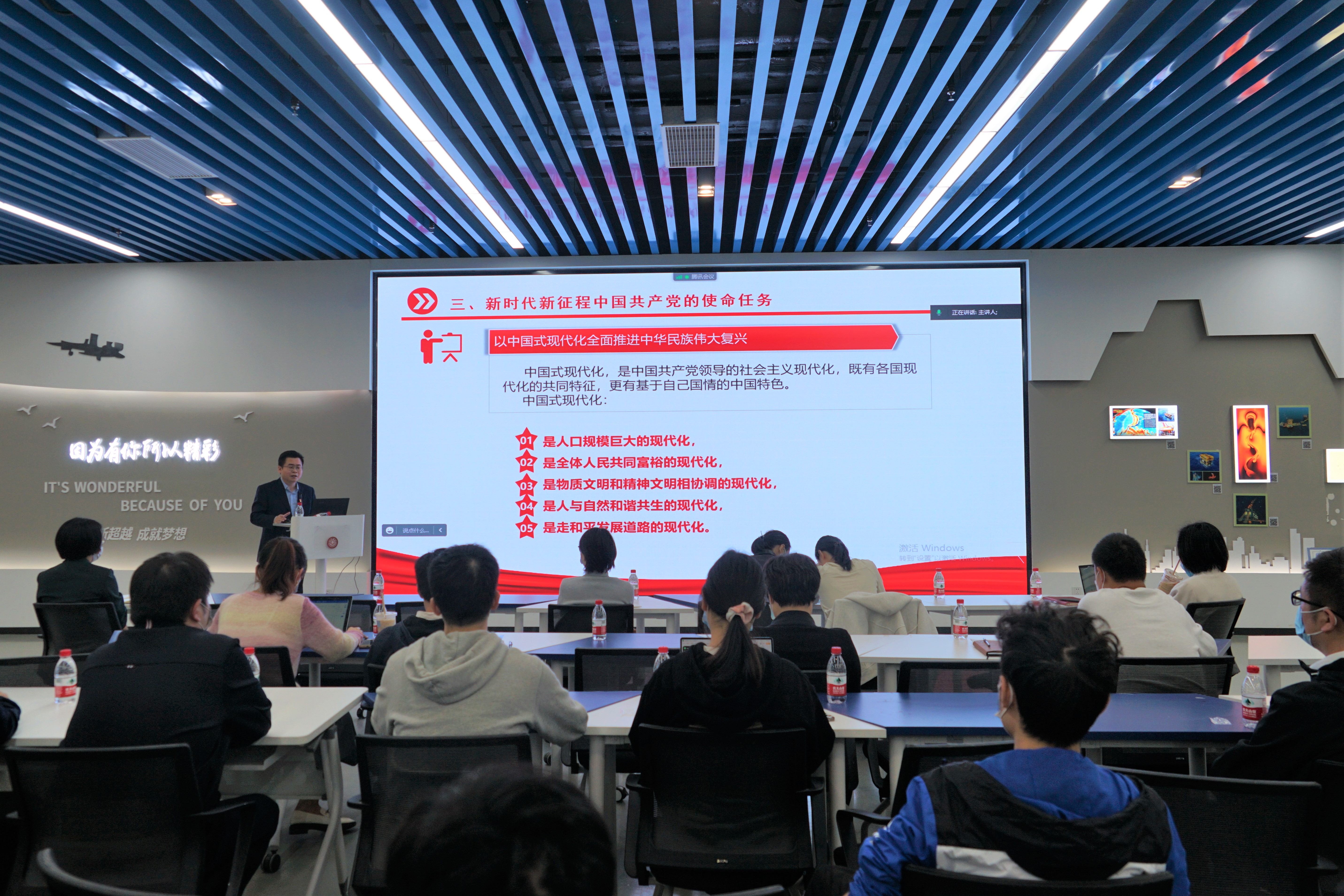 为深入学习贯彻党的二十大精神,10月26日下午, 樱花动漫 、海洋学院、海装基地、网络信息中心联合自然资源部第二海洋研究所海底科学重点实验室党总支和中国极地研究中心(中国极地研究所)等举办学习活动,邀请樱花动漫 马克思主义学院黄庆桥教授做题为《以中国式现代化全面推进中华民族伟大复兴——深入学习贯彻党的二十大精神》的主题讲座。讲座线上线下同步进行,樱花动漫 党委书记周薇、党委副书记王喜芳、网络信息中心党总支副书记周子豪、海洋学院党总支副书记汪佳莹等部分单位师生代表于木兰楼100号主会场参会,同时各单位分别设置分会场,线上师生员工逾400人参与本次主题学习活动。