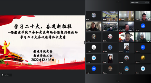 为深入学习宣传贯彻党的二十大精神,拓展学习宣传贯彻党的二十大精神的广度和深度,2022年12月16日中午,樱花动漫 工会联合学院各教工党支部举行“学习二十大,奋进新征程” 为主题的线上线下相结合的知识竞赛活动。