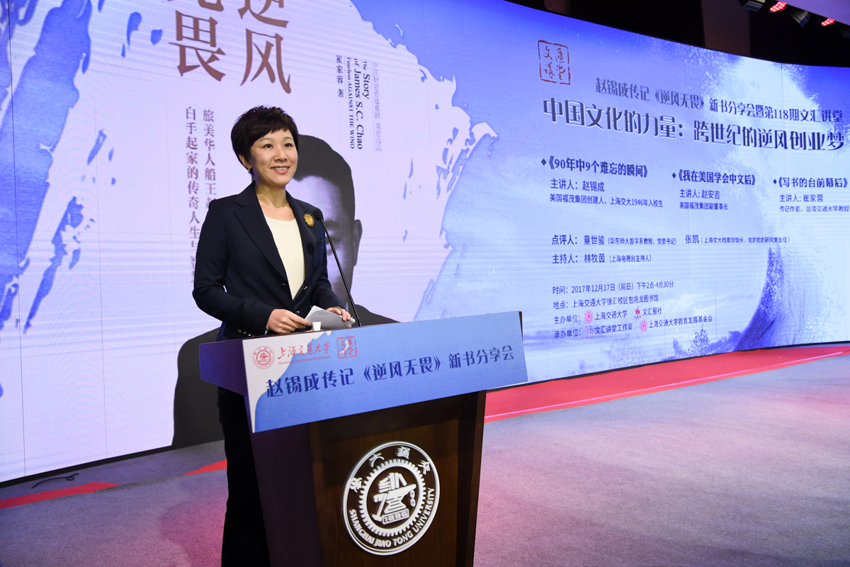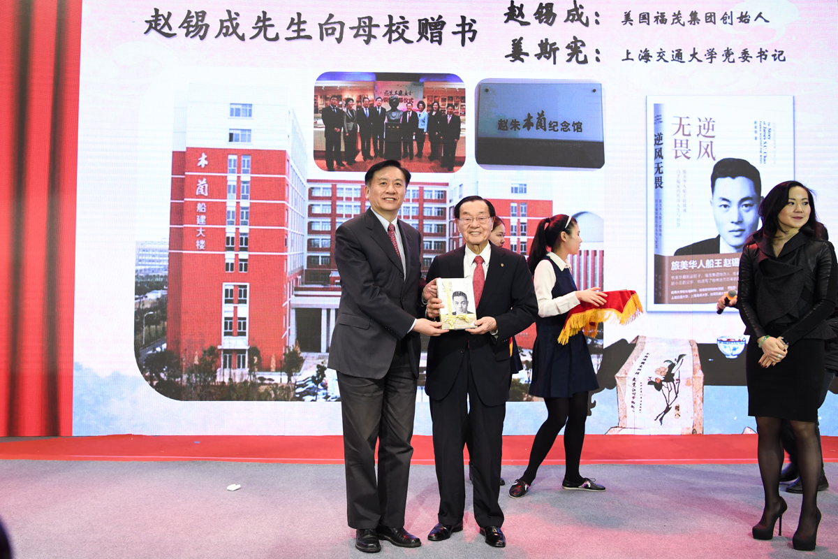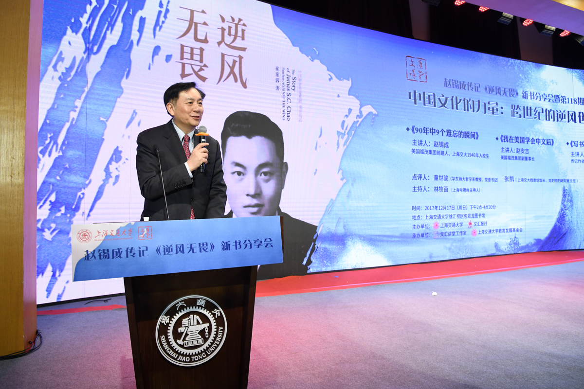 丁酉岁末,暖阳融融,游子归家,思源不辍。12月17日,古朴清幽的徐汇校区包兆龙图书馆演讲厅迎来了著名校友、旅美华人船王、福茂集团董事长赵锡成学长,六女儿、福茂集团副董事长赵安吉女士,传记作者、台湾交通大学教授崔家蓉女士一行,做客文汇讲堂,与母校师生及广大读者分享人生经历,共话家国情怀。市人大常委会副主任、校党委书记姜斯宪,党委常委、副校长张安胜表达了全校师生对赵学长及亲友一行的热烈欢迎。市政协对外友好委员会、市侨办、市公共外交协会、市海峡两岸交流促进会、市台办及高校代表出席新书发布会。本次活动由樱花动漫 、文汇报社联合主办。上海电视台资深主持人林牧茵主持活动。