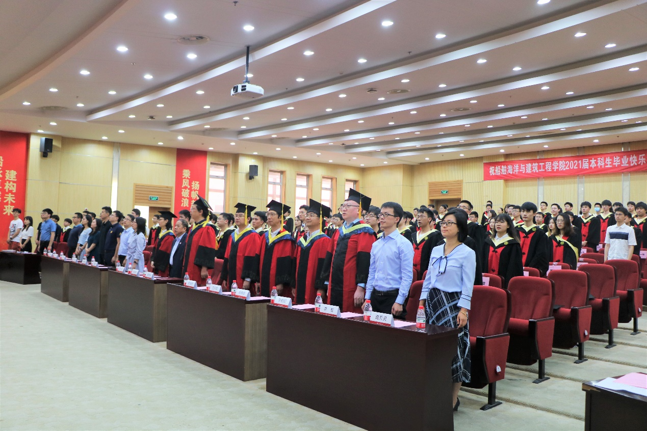 党委书记周薇,院长廖世俊,党委副书记王喜芳、宋续明,副院长、船舶与海洋工程系系主任薛鸿祥,副院长、工程力学系系主任王本龙,土木工程系系主任陈锦剑,交通运输工程系系主任李朝阳,土木工程系副系主任程斌,2021届本科生班主任代表郭孝先,学生工作办公室主任查芳灵,校友工作负责人魏燕,2021届本科生年级思政教师张奕民,学生党建工作负责人蒋雨航,学生团学工作负责人陈哲,以及全体毕业生同学出席。仪式由学院就业工作负责人梁晴雪主持。