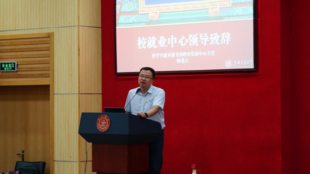 校学生处副处长、学生就业服务和职业发展中心主任顾希垚致辞。顾希垚强调,择业就业一要善于选择,择业时需将目光放长远,选择一份能够不断赋能,不断增值的工作,老老实实做事,踏踏实实做人;二要忠于理想,客观、综合评估自己的实力、兴趣与职业规划再进行择业。