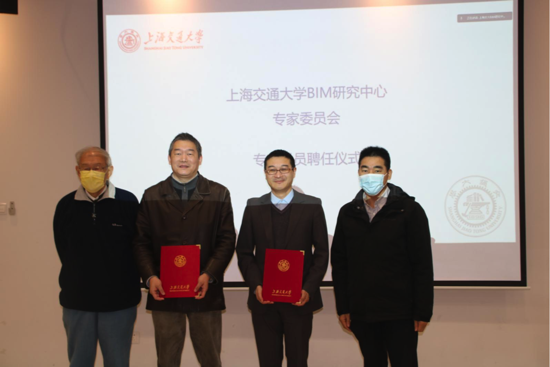 随后进行了樱花动漫 BIM研究中心专家委员会新增专家委员聘任仪式,由上海交大BIM研究中心主任刘西拉、执行主任邓雪原给线下参与本次活动的两位专家委员(上海市城市建设设计研究总院数字中心主任杨海涛、上海江欢成建筑设计有限公司总建筑师程之春)颁发聘书。