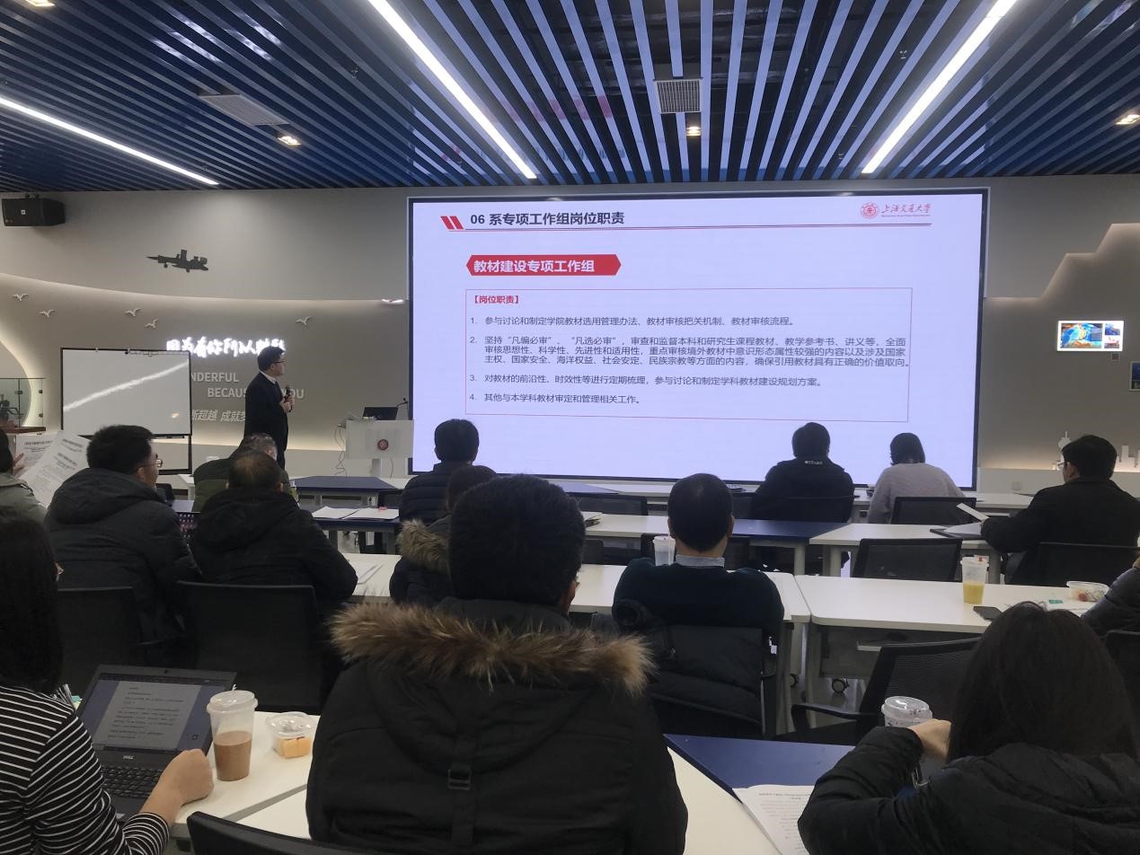 随后,杨健就学院选用教材审查工作机制和近期审查工作安排进行了介绍。为保证教材选用质量,确保优质教材进入课堂,学院将对选用教材进行全面排查,严格落实“教师自查、学科审查、学院复查”三级审核机制,坚持“凡选必审”、“凡编必审”,对选用境内教材、境外教材、自编讲义等进行思想性、科学性、先进性、适用性和时效性等全面审核,进一步规范教材选用与管理工作。