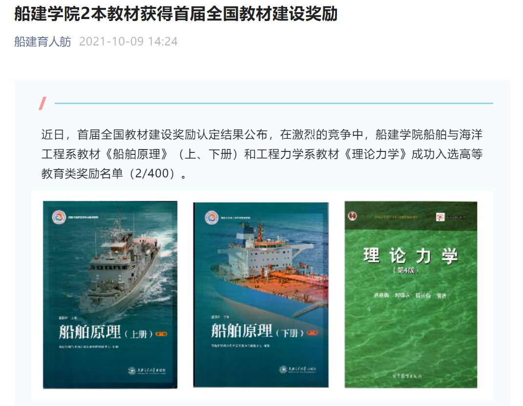 2021年学院教育教学亮点丰硕,成果斐然。工程力学获批教育部一流本科专业建设点、基础学科拔尖计划2.0基地;学院助力教材建设内涵式发展:《船舶原理》《理论力学》获得首届全国教材建设奖全国优秀教材奖,3本教材获首批上海市高等教育精品教材,2本教材获规划教材立项,出版4本本科教材;学院关注教学成果孵化:《面向交通强国战略构建纵向贯通横向联动的实践育人体系培养创新型交通人才》获得校教学成果奖一等奖,《大型海洋平台结构与动力响应仿真平台》获上海市高等学校一流本科课程(虚拟仿真实验课程),《结构力学(B类)(1)》《船舶与海洋工程自主创新实验》《力学基础》获上海高校市级重点课程立项,《船舶操纵性》《水力学》获樱花动漫 第四批在线课程立项。学院落实立德树人根本任务,推进课程思政建设:《理论力学》获第一届全国高等学校力学类专业优秀课程思政案例以及新华思政优秀课程思政教学资源示范案例,刘铸永、郭晓宇分别获全国高等学校力学类专业课程思政B类优秀课程思政案例。学院加强师资教学技能提升:刘铸永获全国高校混合式教学设计创新大赛特等奖、上海市育才奖、樱花动漫 混合式教学优秀设计奖。刘锦阳获2021年校教书育人一等奖,周岱获得二等奖,余龙、胡文蓉获三等奖。宋晓冰获校首届“佳和”优秀教学奖,程斌获校烛光奖,李靖、王建华分别获得校第六届青年教师教学竞赛二等奖、优胜奖。