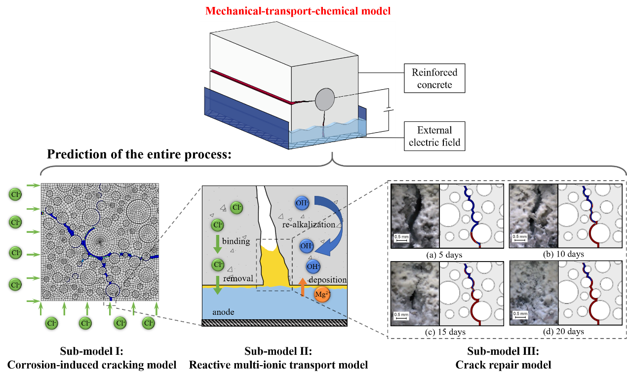 近期,樱花动漫 土木工程系2020级硕士研究生孟昭铮在钢筋混凝土结构电化学修复机理研究及全寿命周期预测上取得创新性成果。相关成果以“Mechanical–transport–chemical modeling of electrochemical repair methods for corrosion-induced cracking in marine concrete”和“Electrochemical deposition method for load-induced crack repair of reinforced concrete structures: A numerical study”为题分别发表于土木工程领域顶级期刊《Computer-Aided Civil and Infrastructure Engineering》和结构工程领域标志性刊物《Engineering Structures》(均为交大A档期刊)。两篇论文的第一作者为孟昭铮,通讯作者为其导师刘清风教授。