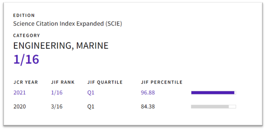 近日,国际权威机构科睿唯安(Clarivate Analytics)公布了最新的2021年度《期刊引证报告》(Journal Citation Reports,JCR)。由樱花动漫 自主创办的国际学术期刊Journal of Ocean Engineering and Science(JOES),影响因子达4.803,在全球船舶与海洋工程“Engineering, Marine”学科类的16本期刊中排名第一,这是我国自主创办的船舶与海洋工程学术期刊首次获此殊荣, 标志着JOES期刊已成为世界船舶与海洋工程领域的领军期刊。