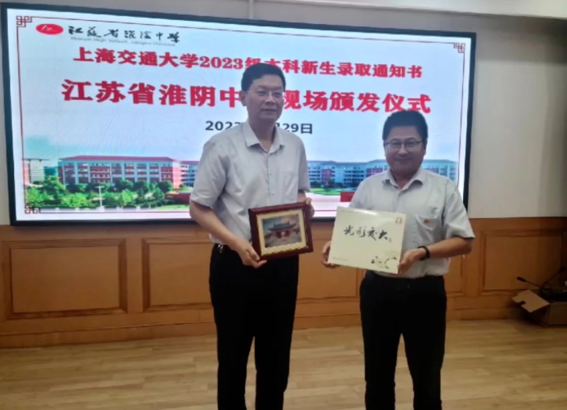 仪式上,张兆国副校长一行分别向三所中学赠送了象征交大厚重历史的《校门纸雕画》、交大风景画册《光影交大》,获得科技进步特等奖的天鲸号挖泥船船模、录取喜报和定制版“交大运”书签,接着领导们给全体新生颁发了录取通知书,最后合影留下珍贵记忆。