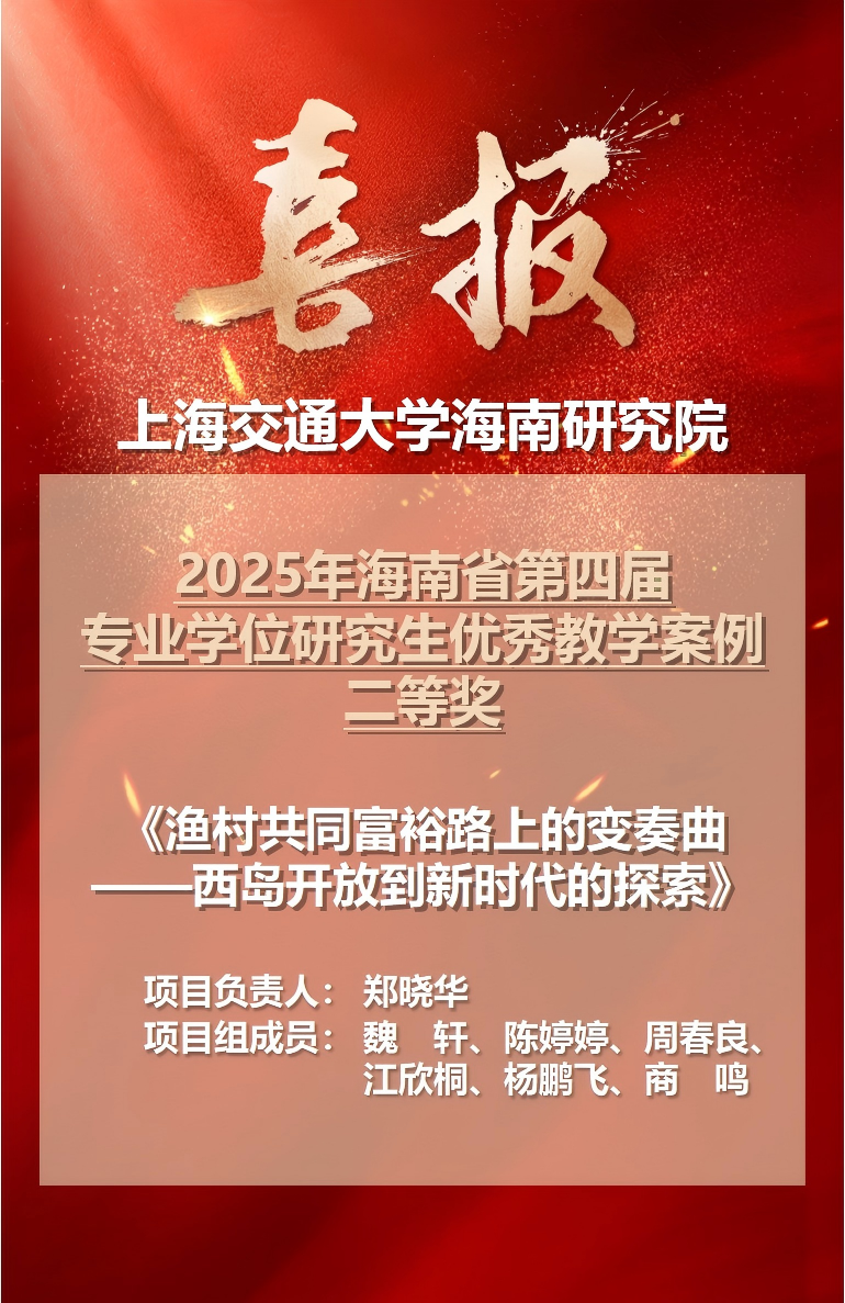 近日,海南省教育厅下发《海南省教育厅关于公布第四届专业学位研究生优秀教学案例评选结果的通知》(琼教高〔2025〕96号),上海交大国际与公共事务学院、海南研究院郑晓华副教授项目组《渔村共同富裕路上的变奏曲——西岛开放到新时代的探索》教学案例荣获海南省第四届专业学位研究生优秀教学案例二等奖。