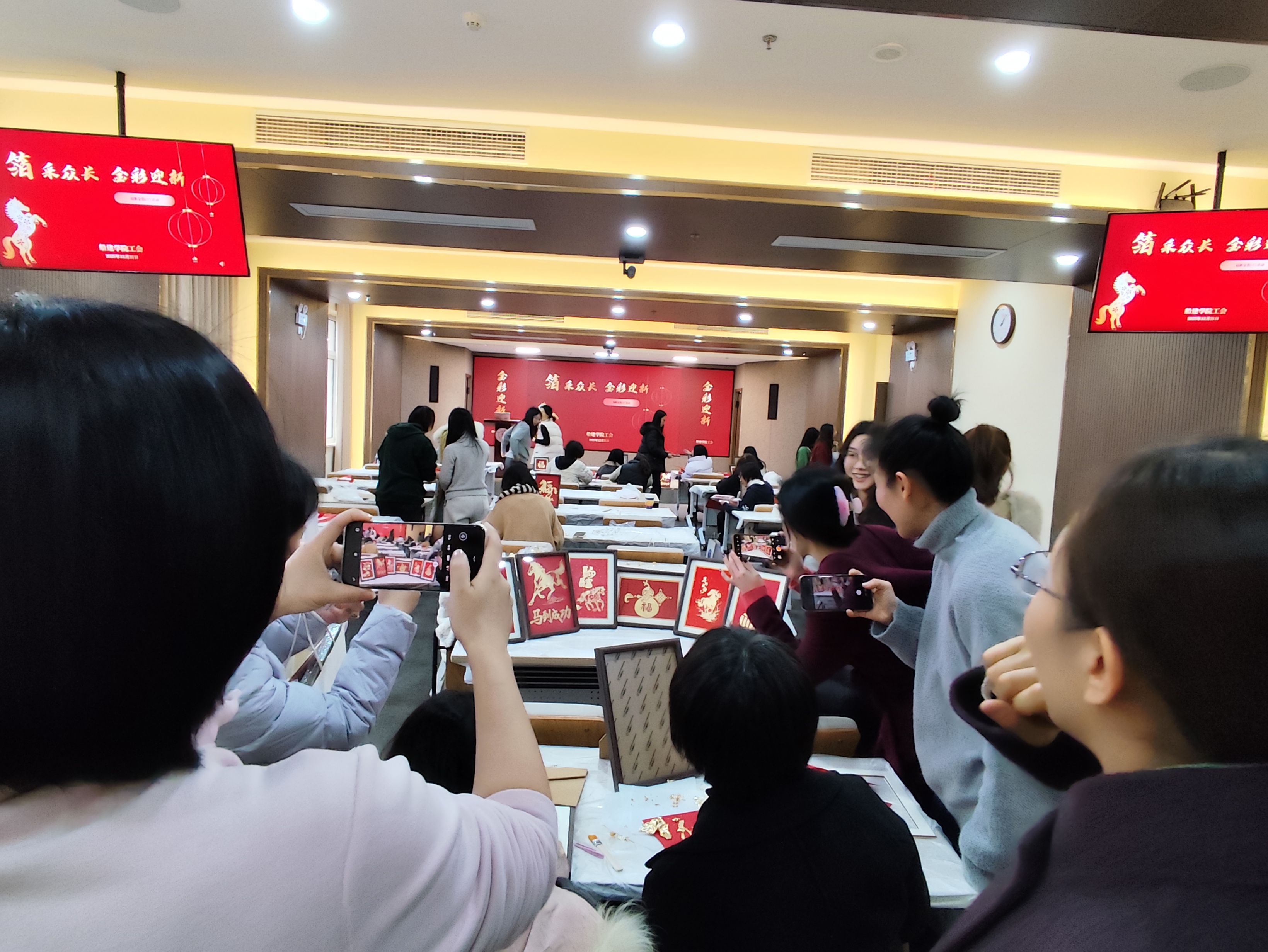 作品摆满长桌,瞬间升级为最火打卡点。大家举起手机,“咔嚓”声此起彼伏,马年祝福与巾帼心愿并肩。镜头里,金箔闪耀,巾帼笑颜比金更亮。