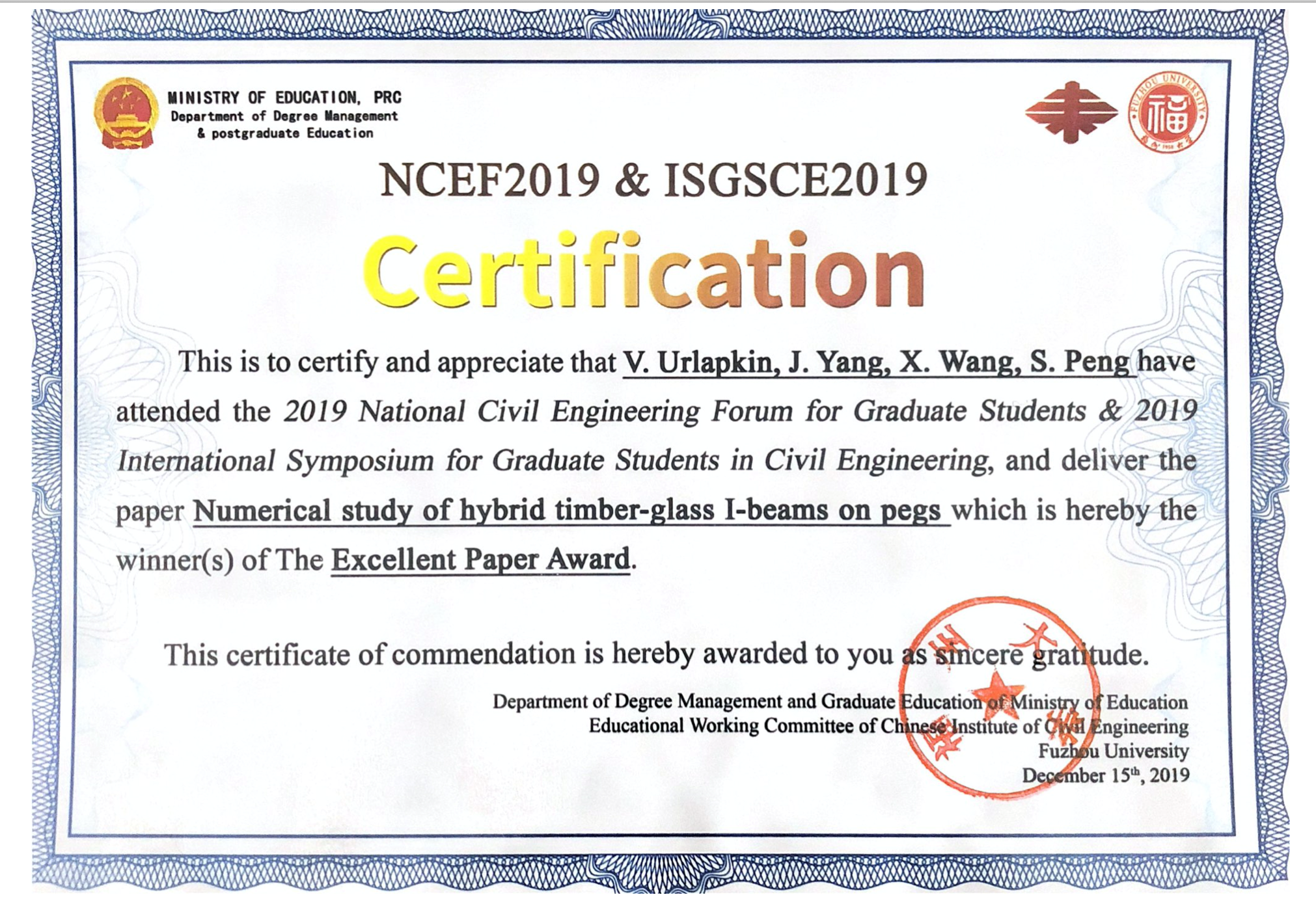 2019年全国土木工程研究生学术论坛(NCEF)暨2019年土木工程研究生国际交流会(ISGSCE)于2019年12月13至15日在福建省福州市召开。本次学术论坛邀请部分院士和专家学者,邀请国外知名专家和国内外土木工程领域优秀博士和硕士研究生参加,以“智慧土木工程的发展与挑战”为主题进行深入的学术交流与研讨。