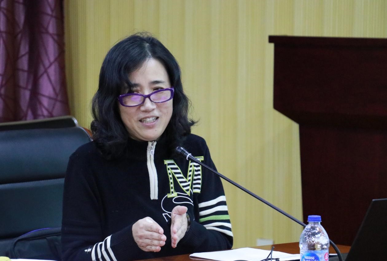 首先,夏利娟介绍了学院课程思政建设背景、前期调研和建设成果,以及推进过程中存在的问题和建议,并结合学科和专业特色阐述了学院课程思政实施方案与举措。她表示,课程思政建设要抓住课程改革核心环节,将教书育人内涵落实于课堂教学主渠道中,实现教书与育人、传道与授业解惑、价值性与知识性、显性教育与隐性教育相统一。
