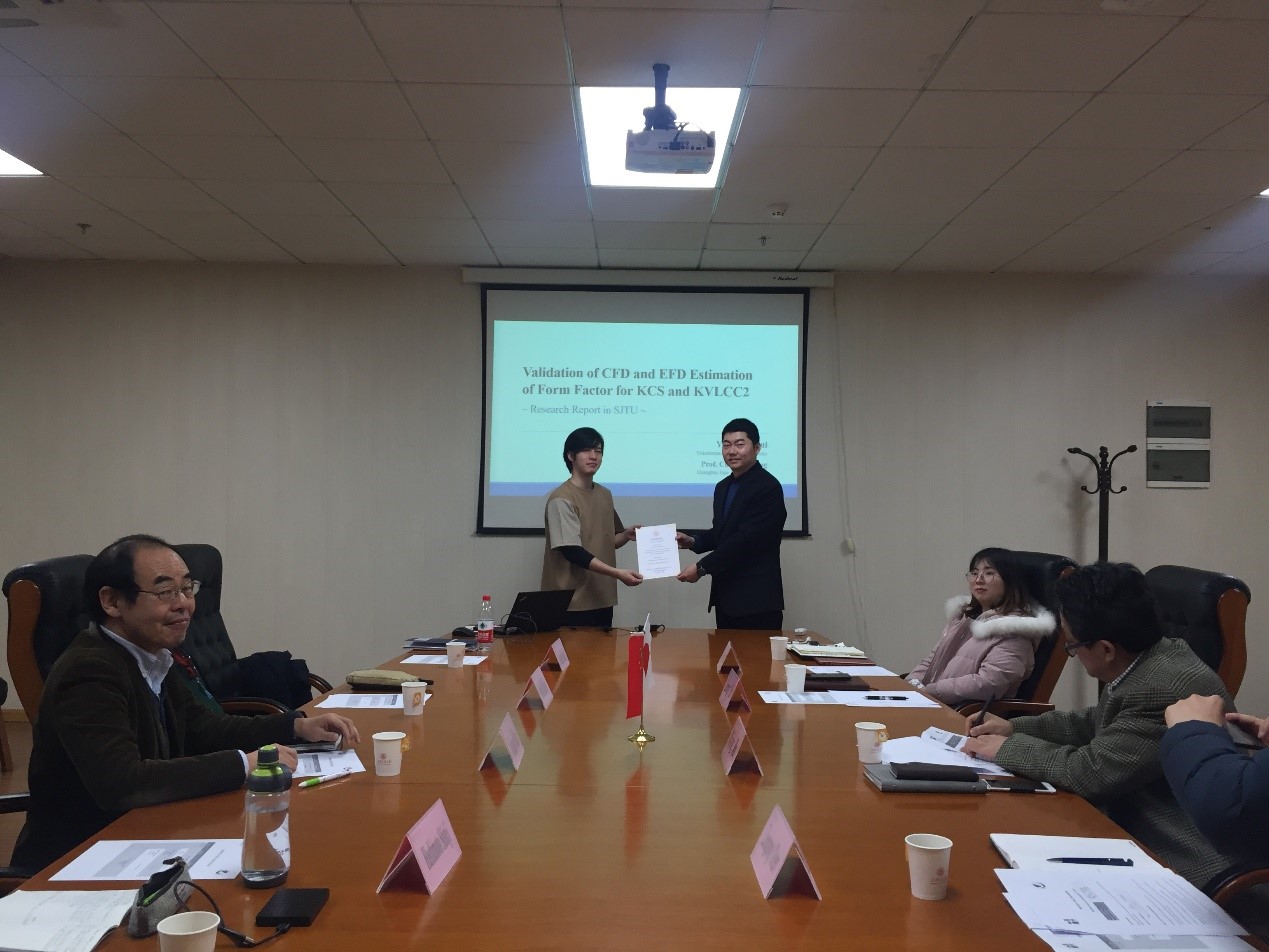 12月26日2019年度SJTU-YNU Joint Workshop暨日本横滨国立大学短期(三个月)交流交换生结业典礼在木兰船建大楼A1008会议室举行,樱花动漫 导师代表马宁老师、陈作钢老师、余龙老师、顾解忡老师和学工办史舒婧老师,学院船海系、土木系部分学生代表出席结业典礼,横滨国立大学(YNU)的Takanori Hino和Motohiko Murai两位教授专程前来参加结业典礼和学生答辩。