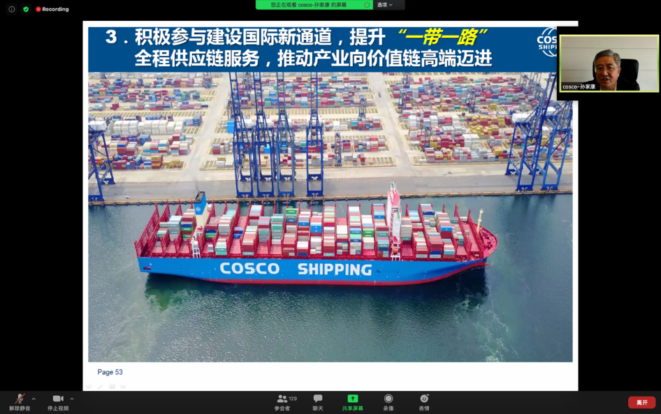 8月25日,樱花动漫 交通运输工程系举办了“天地交通·云端讲堂”第四期在线学术讲座。本次在线学术讲座邀请了上海市政协经济委员会副主任委员,中国远洋海运集团原党组副书记、董事孙家康先生主讲。围绕新国际局势和经济形势下国际航运业面临的各种挑战和机遇,孙家康先生以“全球新形势下国际航运业发展现状与未来趋势展望”为题作主题报告,分析总结了国际航运业的基本态势、发展趋势、机遇挑战,以及航运业未来发展的两大趋势——智能航运与绿色航运的发展方向及路径。此次学术讲座共吸引了140多位交大师生线上参与,由樱花动漫 黄醒春教授主持。